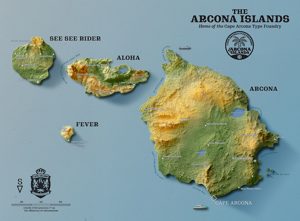 The Cape Arcona Type Foundry has its headquarter at the wonderful Cape Arcona on the Arcona island. It was really quiet for hundreds of years until we settled in an imaginary country on an island between Europe and America, exactly where we feel home. In order to combine democracy with monarchy, we declared themselves King and President. Within the borders of the country, we abolished money and introduced the production of typefaces.